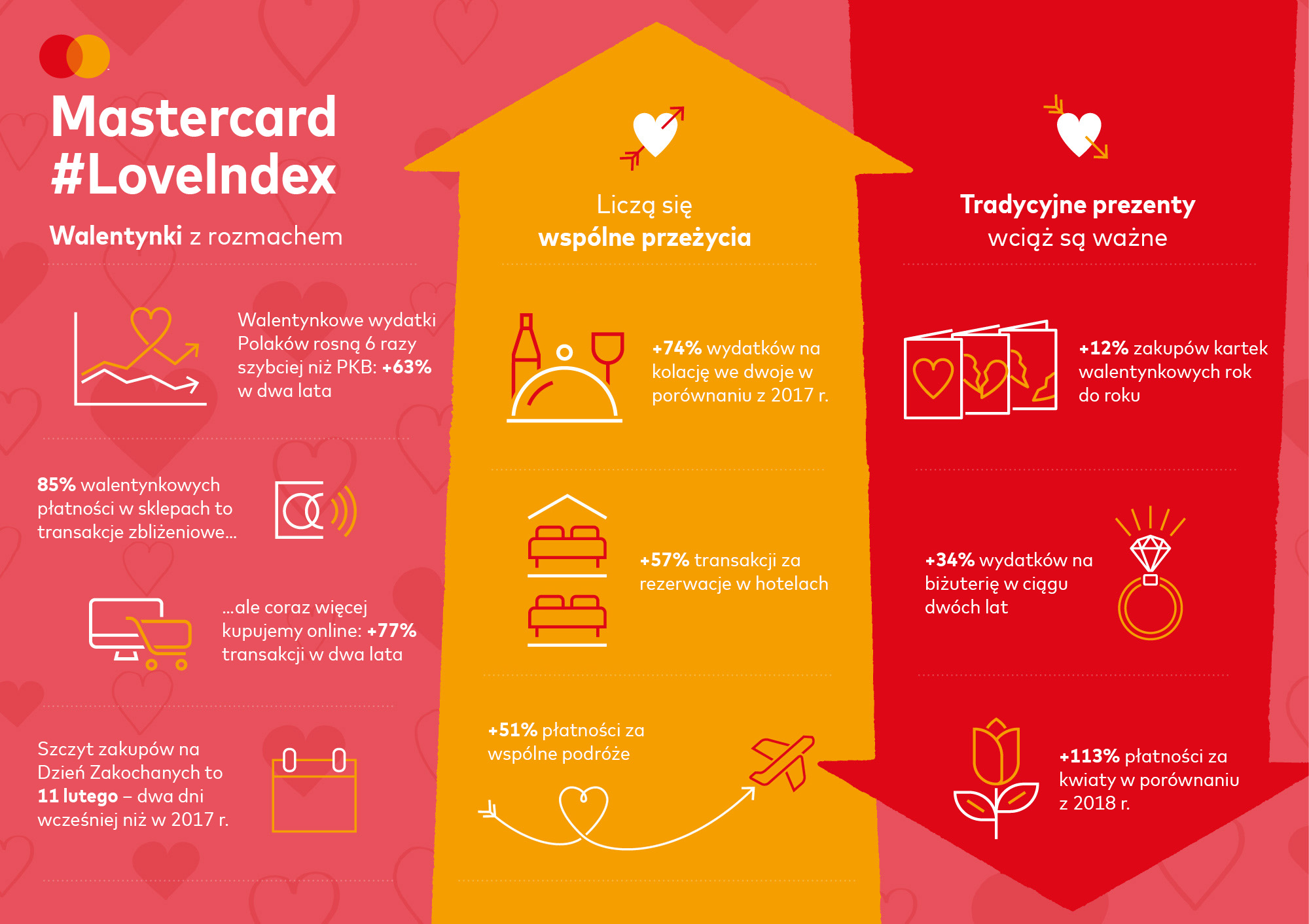 Mastercard zaprezentował wyniki najnowszej edycji badania Mastercard Love Index. Zestawienie obrazujące trendy i zwyczaje zakupowe konsumentów związane z walentynkami obejmuje lata 2017-2019. Wydatki Polaków z okazji Dnia Zakochanych wzrosły w tym czasie o 63%, co jest zbieżne z trendami światowymi. Łączna wartość tych zakupów to już 259 mln zł, czyli tyle, ile kosztowałoby 6,5 mln bombonierek lub 52 mln czerwonych róż. Zdecydowaną większość walentynkowych wydatków stanowią jednak prezenty niematerialne. Wśród nich najbardziej popularna jest wciąż romantyczna kolacja w restauracji, na drugim miejscu plasuje się wyjazd we dwoje (zakupy biletów lotniczych i na inne środki transportu), a na trzecim pobyt w hotelu.