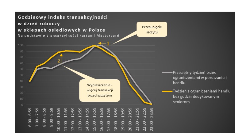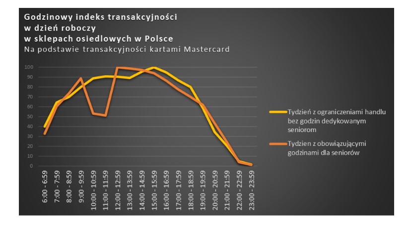 W ostatnich tygodniach widoczny był również efekt tzw. godzin dla seniorów (zniesionych z dniem 4 maja), które spowodowały przesunięcia ruchu w ciągu dnia. Na przykładzie sklepów osiedlowych widać, że w godzinach dla seniorów (10:00-12:00) ruch malał, gdyż był ograniczony do jednej grupy społecznej, zaś bezpośrednio przed i po następowała kompensacja widoczna w większej liczbie transakcji. Niezależnie od tego, czy obowiązywały godziny dla seniorów, czy nie, niezmiennie porami dnia, gdy najmniej osób robiło zakupy, były godziny poranne i wieczorne.
