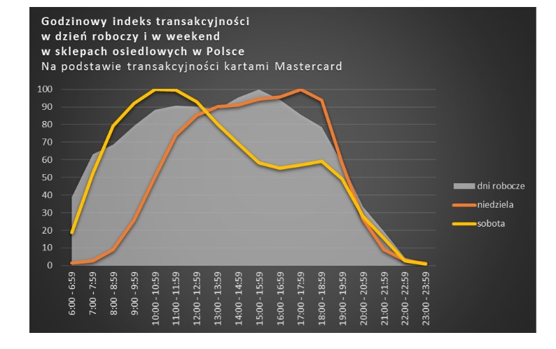 Na przykład, w dni robocze zakupy spożywcze w małych sklepach osiedlowych rozkładają się w ciągu dnia bardziej równomiernie niż przed epidemią. Większe natężenie ruchu, charakterystyczne dla godzin bezpośrednio po pracy, znacząco mniej dominuje nad godzinami poprzedzającymi typową porę powrotów do domu. Jednocześnie szczyt zakupów przesunął się o godzinę wstecz, czyli na 15:00-16:00, a także zaobserwowano zwiększony ruch w godz. 10:00-14:00. Niezmiennie w dni powszednie najmniejsze obłożenie sklepów wciąż widoczne jest wcześnie rano i późno wieczorem.