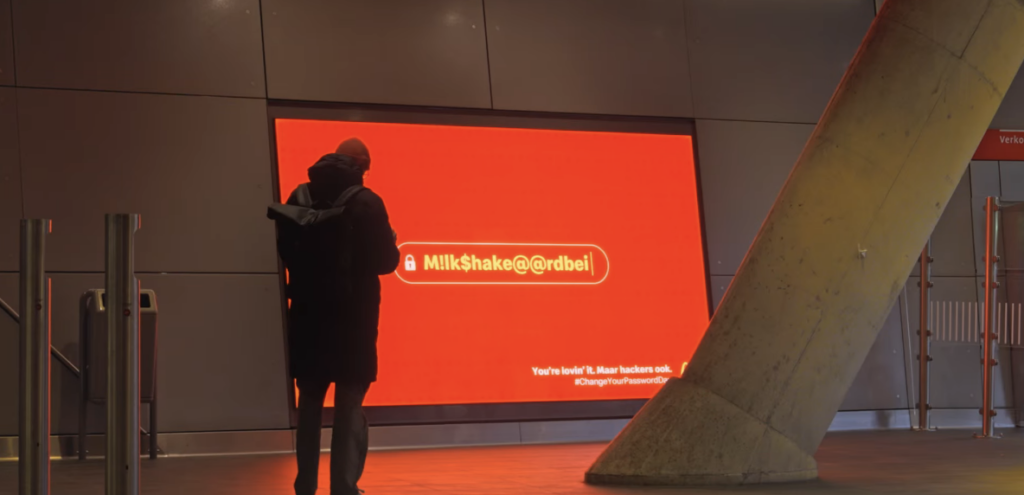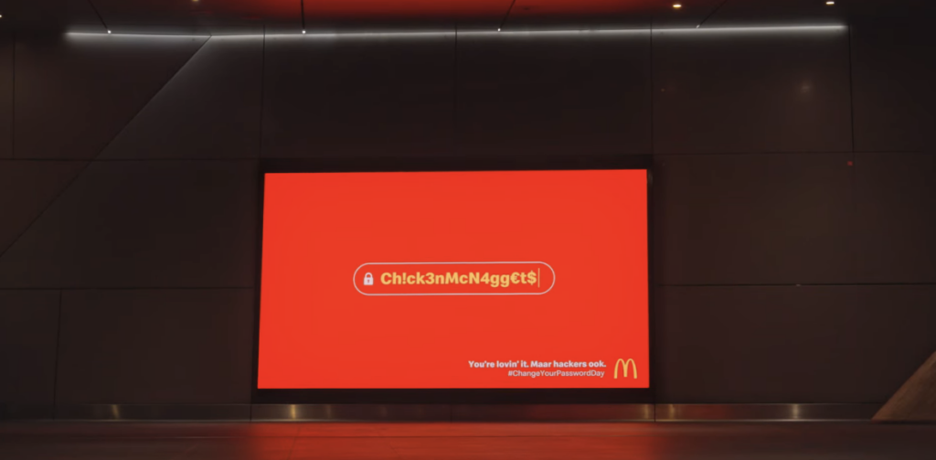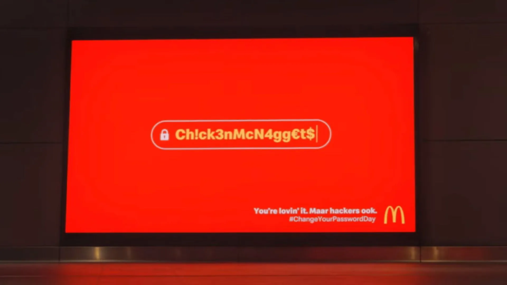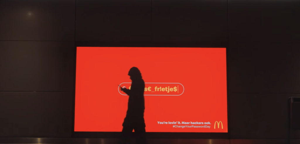W związku z danymi, McDonald’s Netherlands ruszył z kampanią OOH, w ramach której w przestrzeni miejskiej pojawiły się cyfrowe billboardy przypominające pola logowania. Zamiast losowych ciągów znaków umieszczono na nich znajome frazy kojarzące się z siecią restauracji. „fr3nch_fr!es”, „Ch!ck3nMcN4gg3ts” czy „bigmac” zostały zapisane w sposób przypominający „sprytne” hasła tworzone przez użytkowników.