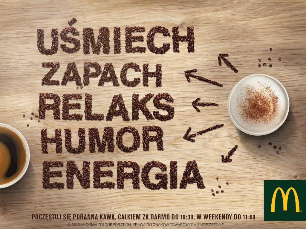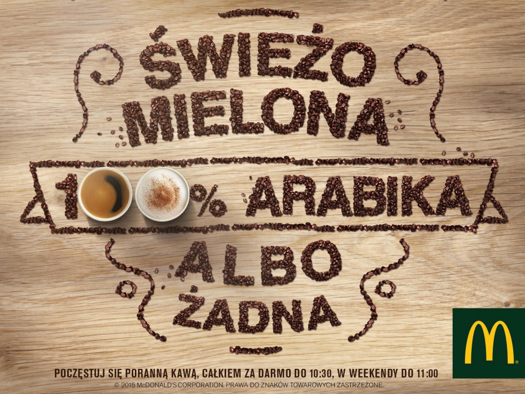 Już po raz kolejny McDonald’s oferuje swoim Gościom poranną kawę całkiem za darmo. Przez dwa tygodnie od startu akcji restauracje zapraszają wszystkich w godzinach porannych do spróbowania aromatycznej 100% Arabiki. Goście mogą wybierać spośród trzech rodzajów kaw: mała kawa biała, mała kawa czarna oraz małe cappuccino. Kawa serwowana jest w opakowaniach na wynos, dzięki czemu można się nią rozkoszować na miejscu w restauracji lub zabrać ją ze sobą. Co ważne, każdy Gość restauracji otrzyma kawę za darmo bez konieczności dokonywania jakiegokolwiek zakupu.