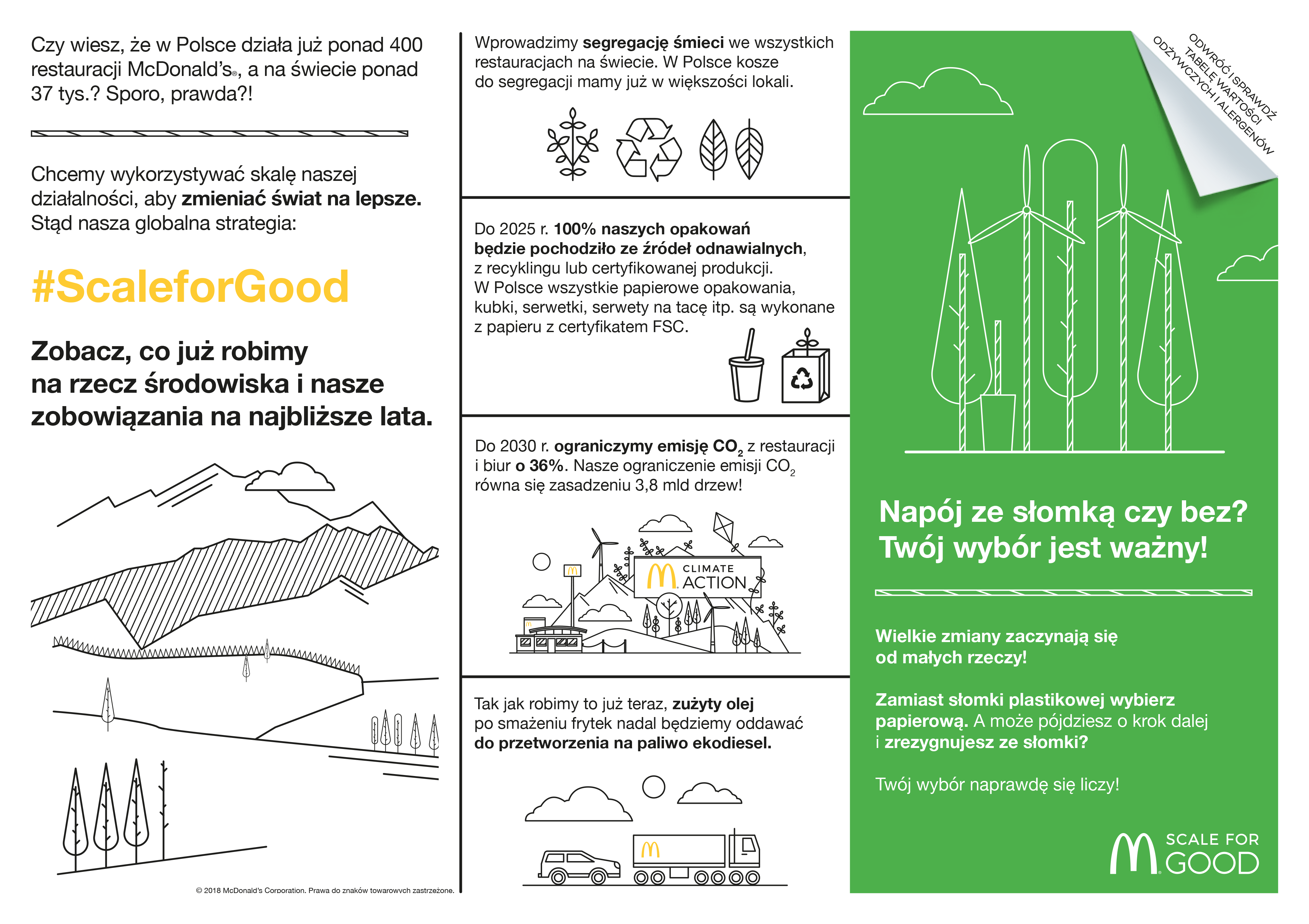 Strategia Scale For Good zakłada również znaczące redukcje emisji gazów cieplarnianych związanych z działaniem restauracji, biur (o 36%) i systemu dostaw (o 30%). Ponad 65% lokali polskiej sieci jest zasilanych energią ze źródeł odnawialnych.