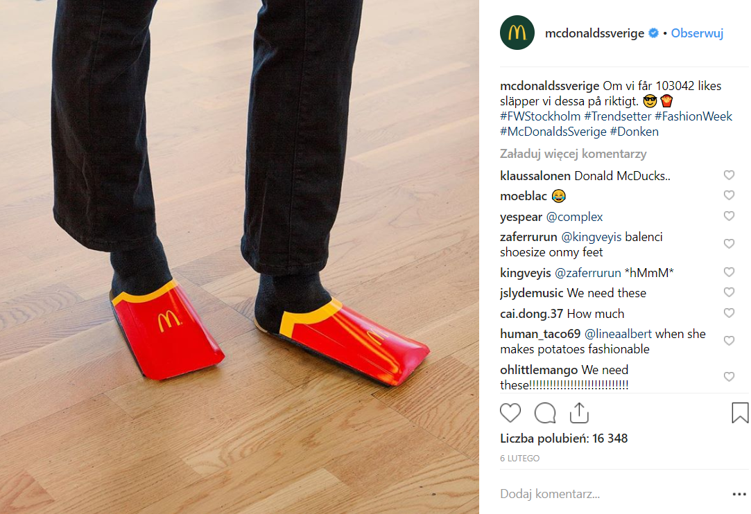Amerykańska sieć fast-foodowa podchwyciła tę myśl, bo na instagramowym profilu szwedzkiego oddziału marki pojawiło się zdjęcie osoby, która ma na stopach „buty” zrobione właśnie z opakowania do frytek.