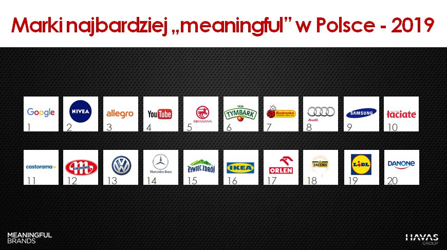 Tak wyglądają kluczowe wnioski z najnowszej fali badania Meaningful Brands 2019, globalnego projektu badawczego grupy Havas, realizowanego w 31 krajach, na grupie 350 000 respondentów i obejmującego 1880 marek. Badanie mierzy siłę marki przez pryzmat korzyści oferowanych ludziom przez dany brand. W Polsce nową falę badania przeprowadzono na ponad 9 tys. respondentów i 105 markach w 11 kategoriach produktowych. W tym między innymi: finanse, motoryzacja, handel, telekomunikacja, żywność, internet i media.