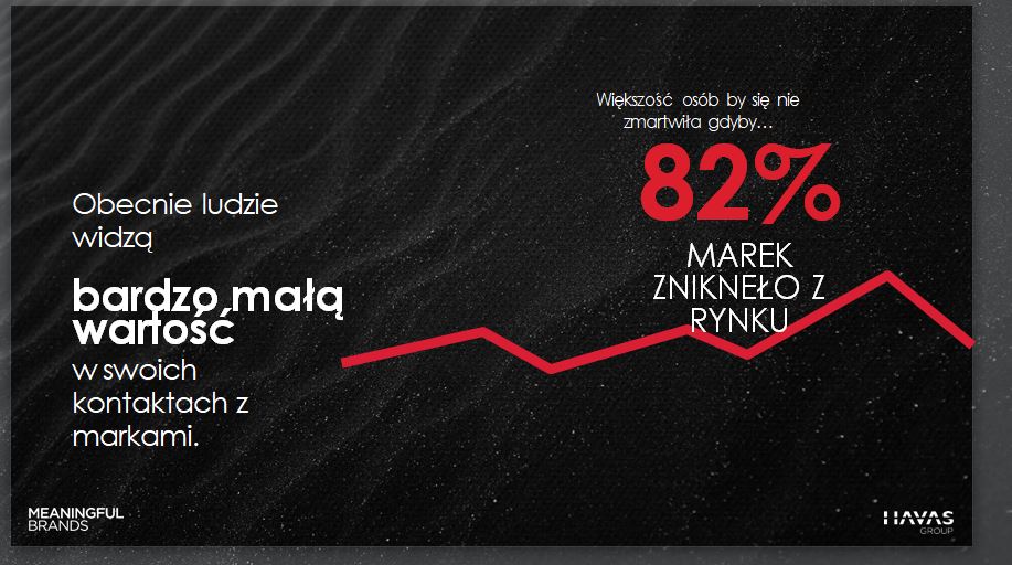 Najnowsze badanie Havas Group, Meaningful Brands 2019 mówi, że aż 82% marek na polskim rynku mogłoby zniknąć i nikt nie zwróciłby na to uwagi. To nie tylko najwyższy odsetek w całej historii badania, ale także bardzo duży, bo to blisko 10% wzrost w stosunku do badania z 2017 r. Globalnie odsetek ten wzrósł o 3 p.p. i obecnie wynosi 77%.