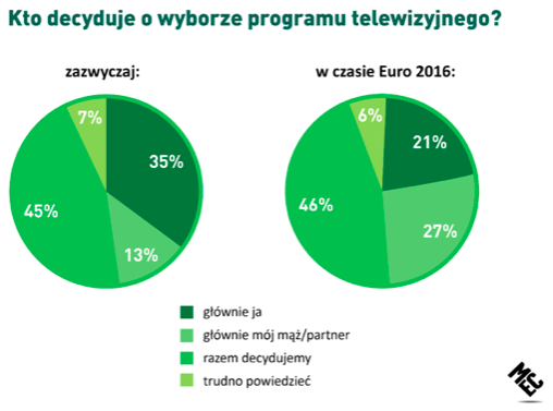 Polskie internautki w czasie Euro 2016 zrzekają się części władzy nad pilotem telewizyjnym – tylko co piąta twierdzi, że w tym okresie będzie główną osobą decydującą o wyborze programu telewizyjnego, pokazało badanie MEC. Standardowo aż 35 proc. kobiet twierdzi, że w ich domach to one są głównymi decydentkami jeśli chodzi o wybór programu. Blisko połowa kobiet, niezależnie od rozgrywek, uważa, że w ich domach panuje równouprawnienie przy wyborze tego, co się ogląda w telewizji.