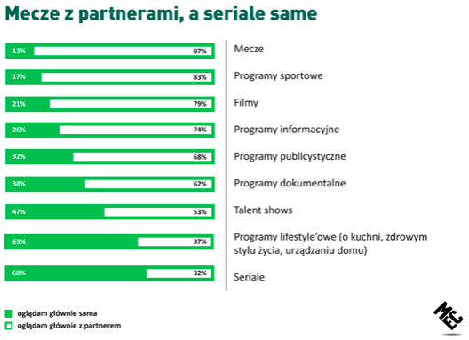 Mecze oraz programy sportowe są tymi, które lwia część badanych przez MEC kobiet ogląda w towarzystwie męża lub partnera. Także filmy, newsy i publicystyka należą do kategorii oglądanych przede wszystkim razem, podczas gdy seriale i programy lifestyle’owe kobiety, jak twierdzą, oglądają w pojedynkę.