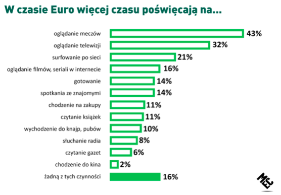 Podczas Euro 2016 spora część kobiet poświęci więcej czasu na oglądanie telewizji i meczów – ponad 40 proc. badanych przez MEC nie będzie w tym czasie szukała alternatywnych rozrywek.  Zaledwie co piąta internautka twierdzi, że podczas Euro więcej czasu spędza na surfowaniu po sieci, 16 proc. ogląda częściej filmy i seriale w internecie, a co dziesiąta – zaplanowała na ten czas aktywniejsze zakupy.