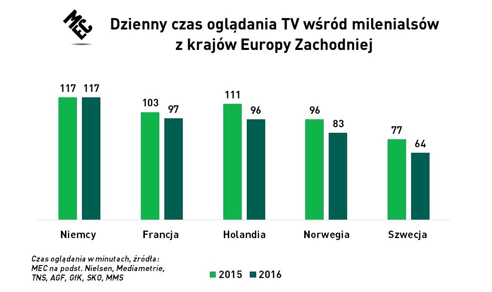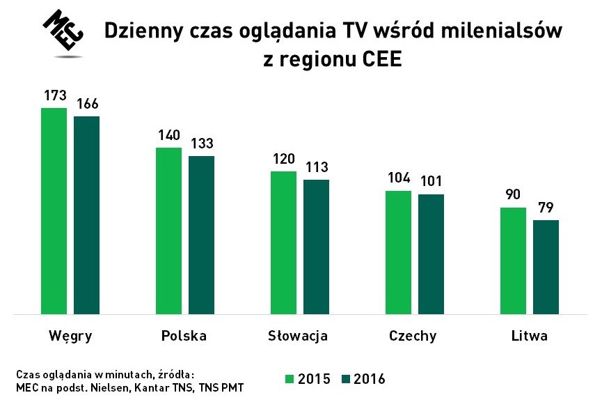Polska, z 5 proc. spadkiem ATV (średni dzienny czas oglądania) w grupie 13-29 lat, ma zbliżone statystyki do innych państw regionu. Ze 133 minutami (2 godziny i 13 minut) spędzanymi wciąż przez milenialsów na oglądaniu telewizji, jest zaś w ścisłej czołówce rankingu krajów o najwyższym czasie oglądania. Dotyczy to zresztą wszystkich grup wiekowych. W regionie wyprzedzają nas jednak Węgrzy, gdzie 13-29-latkowie siedzieli w ub.r. przed telewizorami 166 minut dziennie i Rumuni, u których czas oglądania sięgał aż 185 minut. Najkrócej – bo tylko 79 minut dziennie – oglądali telewizję millenialsi z Litwy. Niespełna co 3. telewidz z tej grupy włączał tam telewizor codziennie przynajmniej na 5 minut (dla porównania – w Polsce, Czechach i Słowacji – robiło to ok. 46 proc. widzów w tym wieku).