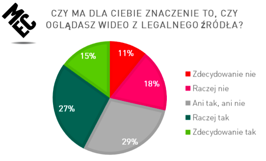 Kwestia legalności oglądania nie leży mocno na sercu polskim e-widzom. Blisko 60 proc. badanych nie przywiązuje wagi do tego, czy ogląda wideo legalnie. Za zdecydowanie ważną uznaje tę kwestię zaledwie 15 proc. badanych, w grupie 15-24 lata ich odsetek spada do 6 proc.