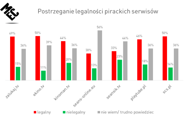 Średnio zaledwie po kilkanaście procent badanych uważało, że czołowe pirackie serwisy są nielegalne. Około połowy – w odniesieniu do większość z nich – sądziła, iż działają zgodnie z prawem. W przypadku czołowych legalnych serwisów VOD odsetek przekonanych o legalności sięga 80-90 proc.