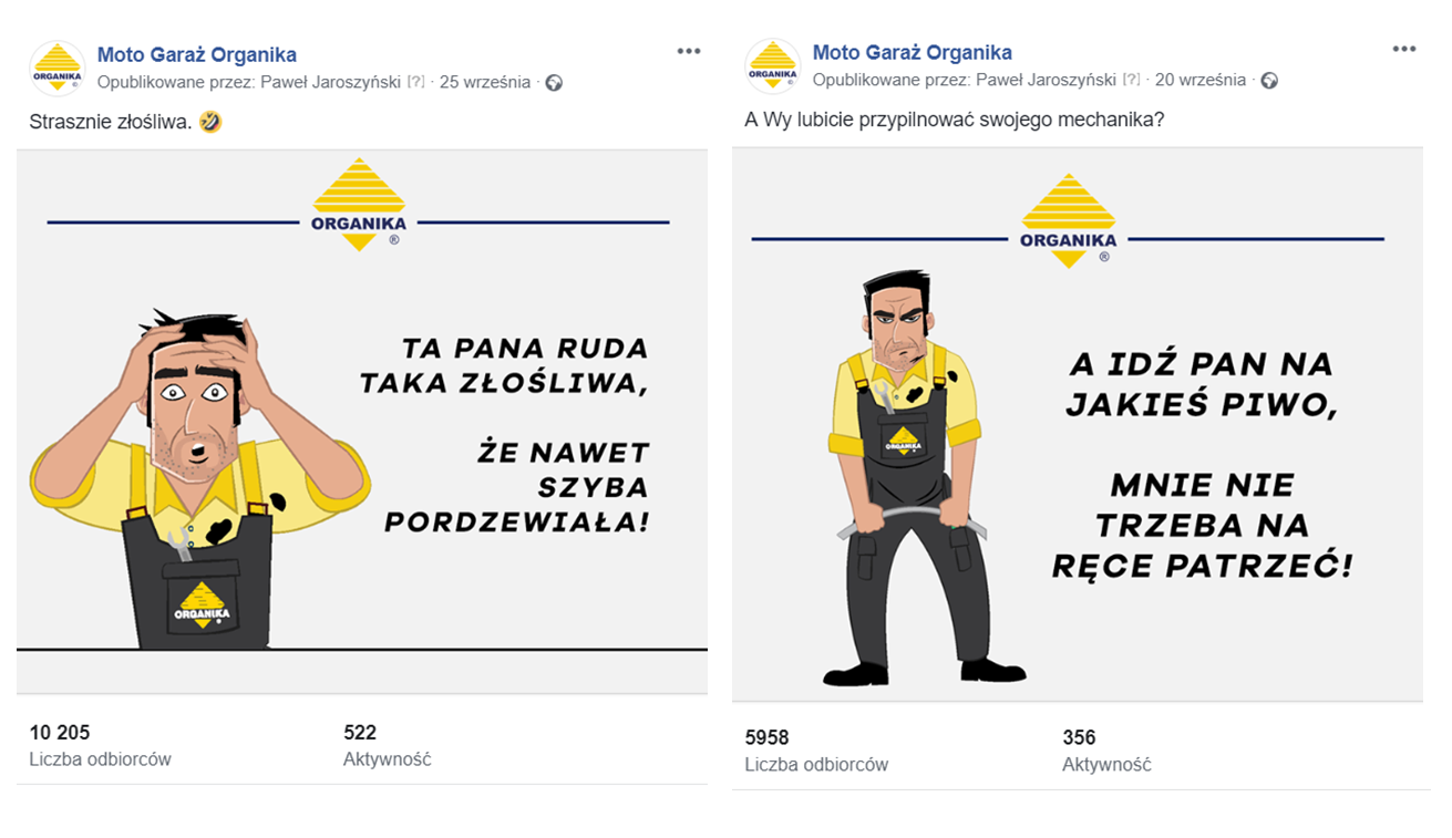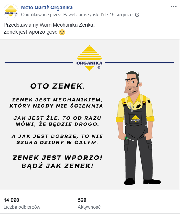 Łączna liczba odbiorców, do których dotarł Mechanik Zenek to 361 224. Średnio każdy opublikowany post z Zenkiem w głównej roli docierał do ponad 16 000 odbiorców. Łączna liczba aktywności, które wygenerowały posty z naszym brand hero to 16 378. Średnio ok. 744 aktywności na post.