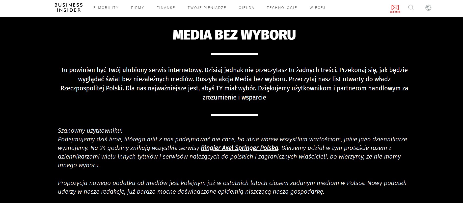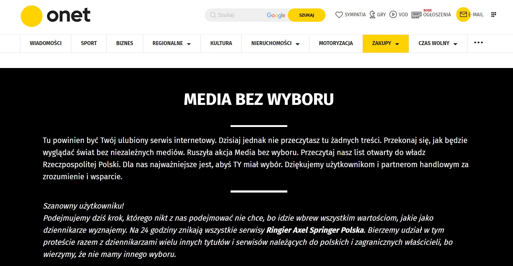 Ponadto, w ramach akcji w środę na stronach głównych najpopularniejszych portali, takich jak Onet.pl czy Businessinsider.pl, w stacjach telewizyjnych (TVN, Polsat), a także na pierwszych stronach wielu dzienników (Rzeczpospolita oraz Dziennik Zachodni), zamiast najnowszych wiadomości, pojawił komunikat na czarnym tle.