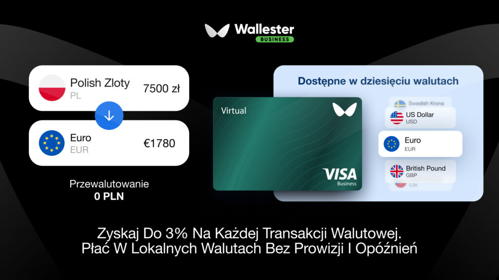 Wallester Business jest darmowy na zawsze, jeśli 300 wirtualnych kart wystarcza na Twoje potrzeby. Nie ma miesięcznych opłat za konto, kosztów utrzymania kart, doładowania w EUR są bezpłatne, podobnie jak przewalutowanie euro na PLN, a obsługiwanych jest dziewięć europejskich walut plus USD, wszystko bez ukrytych opłat.
