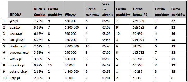 Do krótkiego badania wykorzystany został ranking sklepów internetowych przygotowany przez Money. pl** za rok 2015, który analizował sklepy m.in. pod względem asortymentu, jakości obsługi, szybkości dostawy czy interakcji z klientem (np. kanały kontaktu). Z rankingu sklepów wybrano kategorię URODA, gdzie przeanalizowane zostały internetowe perfumerie, drogerie i sklepy jubilerskie. Ranking przygotowany przez Money.pl wyłowił 10 najlepszych przedstawicieli e-commerce, które zostały przez Apellę wzięte pod lupę i przeanalizowane pod kątem czasu spędzonego przez użytkownika na stronie, ruchu ogólnego oraz tego generowanego przez media społecznościowe, a także wielkości profilu na Facebooku. Wszystkie sklepy z rankingu prowadziły komunikację w Social Media, a dzięki narzędziu SimilarWeb*** udało się zebrać potrzebne dane dotyczące ich witryn internetowych. Dane te mogą być poddane pod wątpliwość przez osoby mające dostęp do dokładnych statystyk omawianych witryn, jednak dla wszystkich serwisów kryteria były jednakowe (dane zebrane 19.01.2016 r.). Z profili w mediach społecznościowych wybrany został Facebook, który według danych posiadanych przez Apellę jest głównym generatorem ruchu z kanału social (ok. 85–90%).