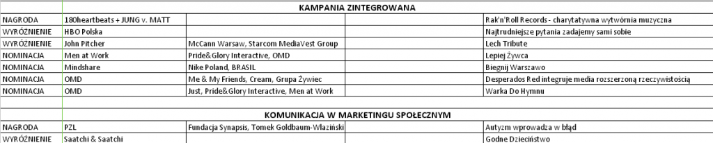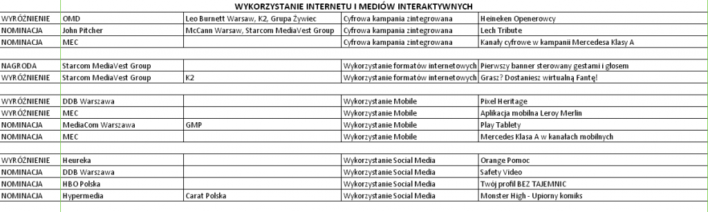 Pozostałe agencje docenione w tegorocznym konkursie to: MEC, MediaCom Warszawa, Tribal DDB, John Pitcher, K2, 180Heartbeats + Jung v. Matt, Heureka, Mindshare Polska, PanMedia Western, Lemon Sky, The Digitals, McCann Warsaw, PZL, Cheil Poland, Tequila Polska, McCann Warsaw, Leo Burnett Warsaw, Brasil.