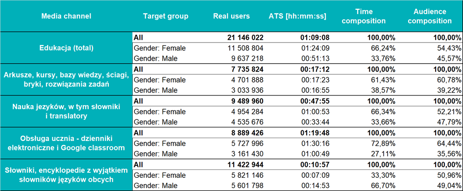 Analiza grup wiekowych wskazuje na różnice w sposobie konsumpcji treści edukacyjnych przez użytkowników z różnych pokoleń. O ile aktywność internautów w wieku szkolnym na stronach ze ściągami i brykami jest oczywista (blisko 37% użytkowników stanowią osoby do 19. r.ż., odpowiadając za prawie 55% łącznego czasu spędzanego na takich stronach), o tyle uwagę zwraca popularność stron i aplikacji językowych wśród najstarszych odbiorców. Internauci w przedziale 55-75 to blisko ¼ wszystkich użytkowników serwisów związanych z językami obcymi, odpowiadają oni też za 36,5% ogółu spędzanego na nich czasu.