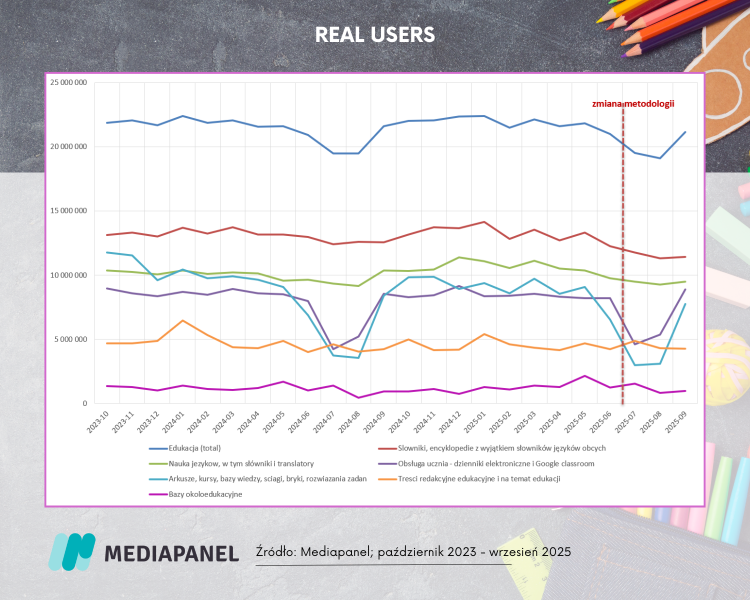 Analizie poddano strony i aplikacje z kategorii „Edukacja”, pod uwagę wzięto dane za okres od października 2023 do września 2025. W lipcu 2025 w badaniu Mediapanel wdrożono metodę JAR Flex, która może mieć wpływ na wyniki, co trzeba uwzględnić przy ich interpretacji.