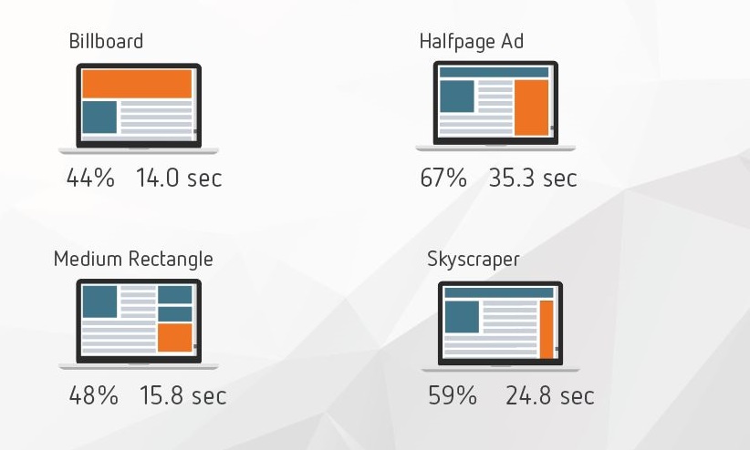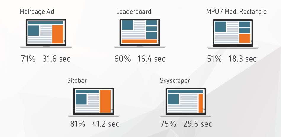 W podsumowaniu europejskim kolejność czołówki, jeśli chodzi o formaty reklamowe, jest inna: najlepszy wynik odnotowuje sitebar (viewability – 81 proc., viewtime – 41,2 sek.), za nim plasuje się skyscraper (75 proc. i 29,6 sek.) oraz halfpage (71 proc. i 31,6 sek.).