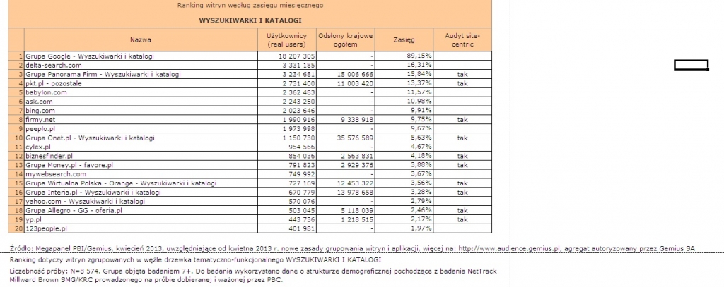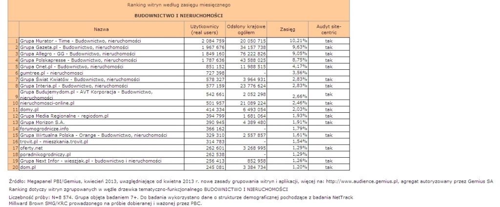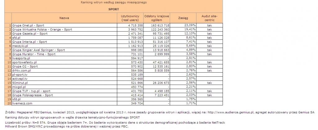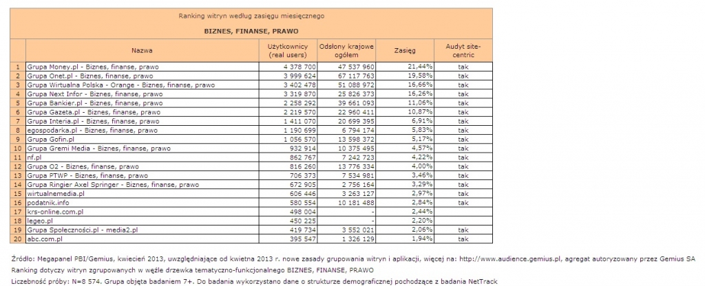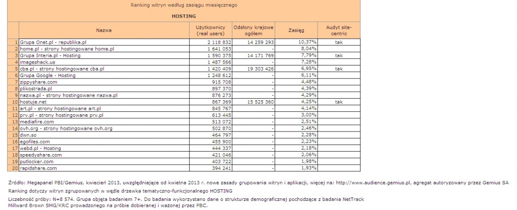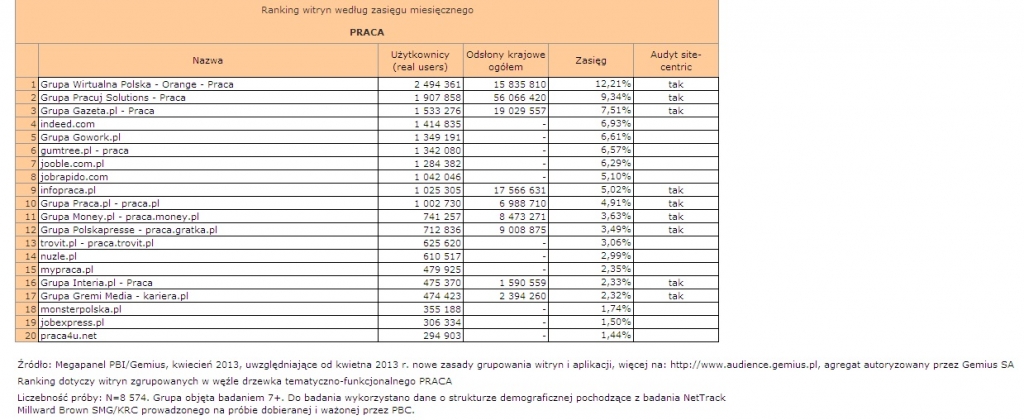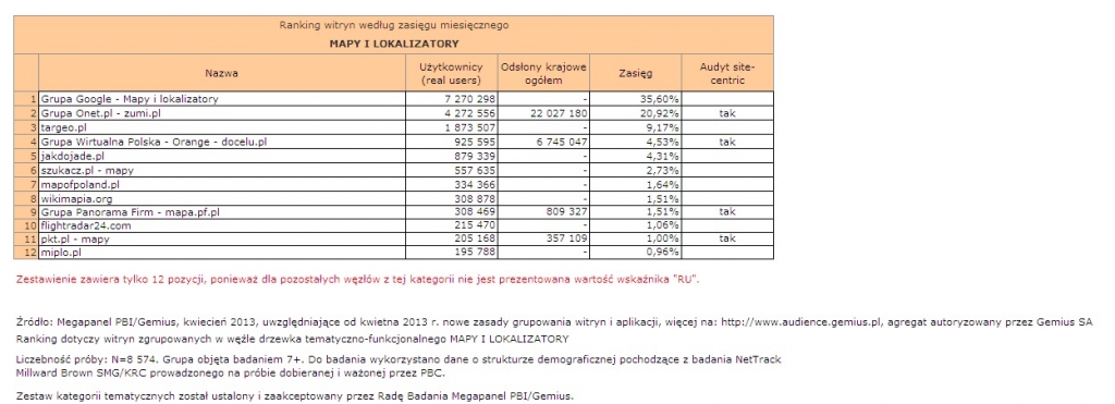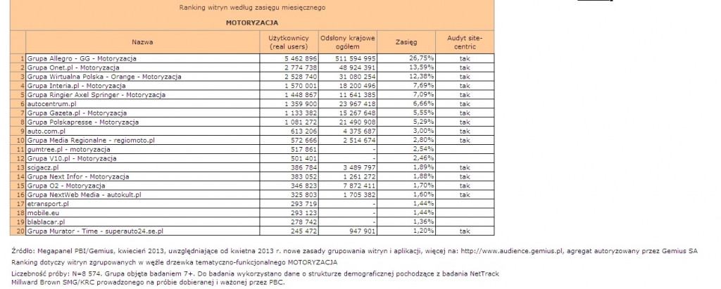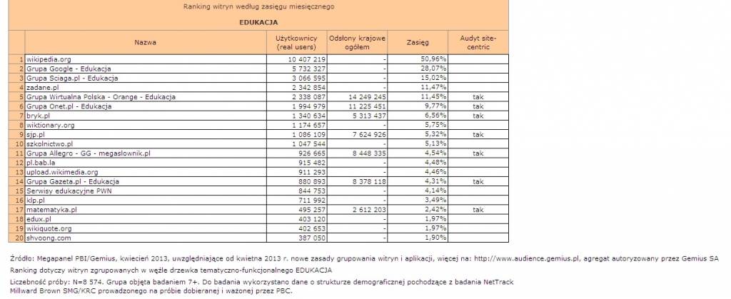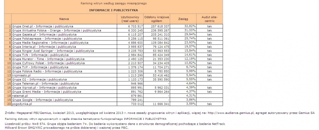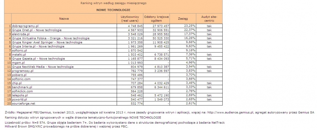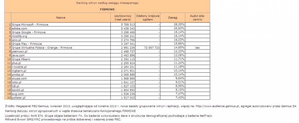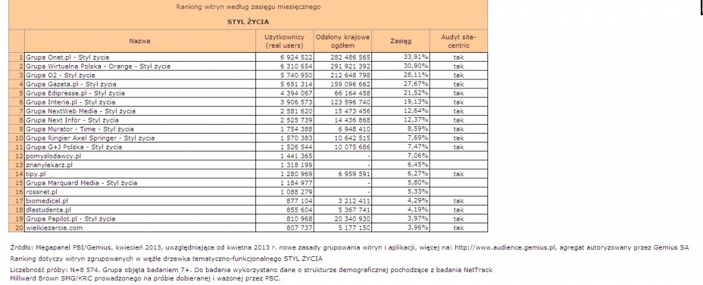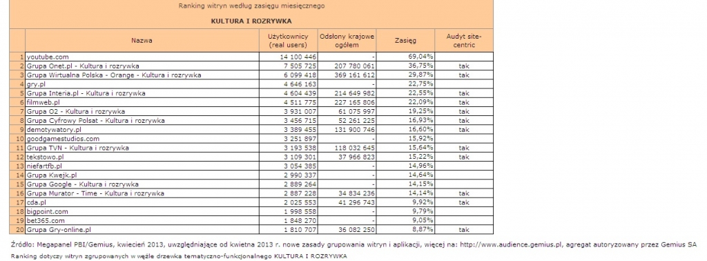 Od kwietna 2013 roku badanie uwzględnia nowe zasady grupowania witryn i aplikacji. Więcej o zmianach i metodologii: www.audience.gemius.pl.