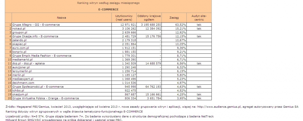 W rankingu grup witryn i witryn niezgrupowanych objętych audytem site-centric wg zasięgu prowadzą Grupa Allegro – GG, Grupa Onet.pl i Grupa Wirtualna Polska – Orange.