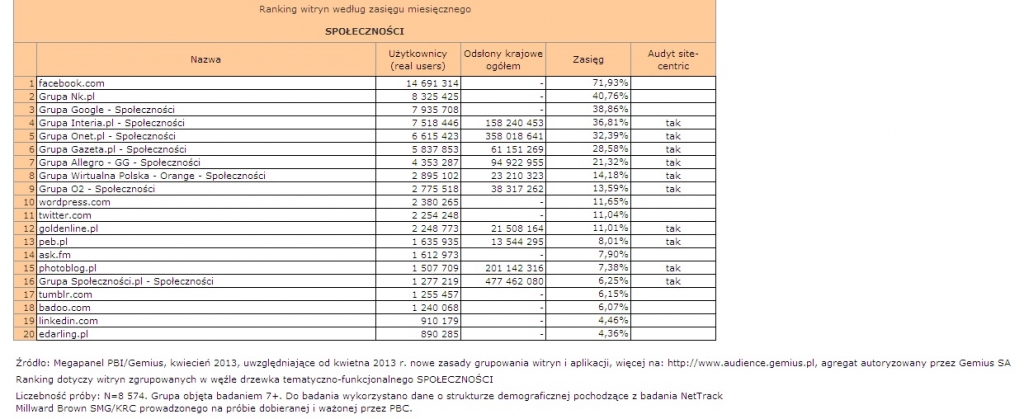 - Społeczności: facebook.com (14,7 mln RU), grupa Nk.pl (8,3 mln RU) oraz Grupa Google (7,9 mln RU)