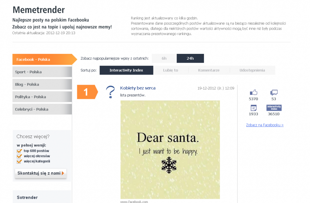 – Najpopularniejsze posty to niekoniecznie komunikacja wysokiej jakości. Wiele jest zdjęć kotków i piesków, zabaw polegających na wpisaniu czegoś w komentarzu czy udostępnieniu posta oraz mniej lub bardziej śmiesznych czy ciekawych obrazków z serwisów typu Demotywatorów i Kwejka. Nie ma się jednak co dziwić, takie są masowe gusty. Najpopularniejszym pismem w Polsce jest przecież Tele Tydzień, a nie Tygodnik Powszechny. – komentuje dr Jan Zając, psycholog Internetu z Uniwersytetu Warszawskiego i Prezes Zarządu Sotrendera. – Memetrender pozwala jednak wychwycić także naprawdę ciekawe i oryginalne memy, o których mówi się na Facebooku i które udostępniają użytkownicy tego serwisu.