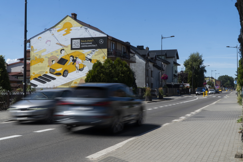 Pierwszym elementem konceptu jest mural, który powstał na ścianie jednego z pensjonatów, stojących tuż przy drodze prowadzącej z Chałup do Władysławowa. Na tym odcinku turyści powracający z weekendów i wakacji zwykle spędzają sporo czasu, mozolnie przesuwając się w sznurze innych samochodów. – Mural w warstwie graficznej nawiązuje do rodzinnych wakacji nad morzem, pokazaliśmy na nim naszą nową Klasę T, czyli mały van premium, w którym wygodnie może podróżować kilkuosobowa rodzina, z psem i sprzętem sportowym. Utrzymany jest w jasnej, pogodnej kolorystyce, ale to nie wszystko – wyjaśnia Piotr Wójcik z Mercedes-Benz Polska. – Zależało nam na tym, żeby nie poprzestać tylko na zwykłej reklamie pojazdu, ale wykorzystać specyfikę miejsca i kontekst. Każdy, kto miał okazję wracać z Helu, wie, ile czasu zajmuje odstanie w korku do Władysławowa, wspólnie z agencją Team X postanowiliśmy więc do tego nawiązać i umilić ten czas podróżującym.