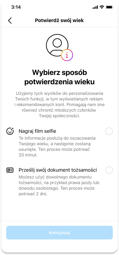 Od dzisiaj na Instagramie pojawi się nowy sposób weryfikowania wieku użytkowników poniżej 18 roku życia, którzy chcą zmienić swoją datę urodzenia. Jeżeli osoba nieletnia spróbuje zmienić swój wiek na Instagramie, platforma poprosi o weryfikację na jeden z dwóch sposobów:
