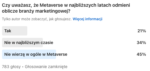 Coraz więcej użytkowników przestaje w ogóle wierzyć w fakt, że metaverse odmieni marketingową rzeczywistość. Potwierdza to m.in. ankieta, którą przeprowadziliśmy na naszym profilu na LinkedInie. Jej wyniki mówią same za siebie. Aż 45% ankietowanych w ogóle nie wierzy w metaverse.