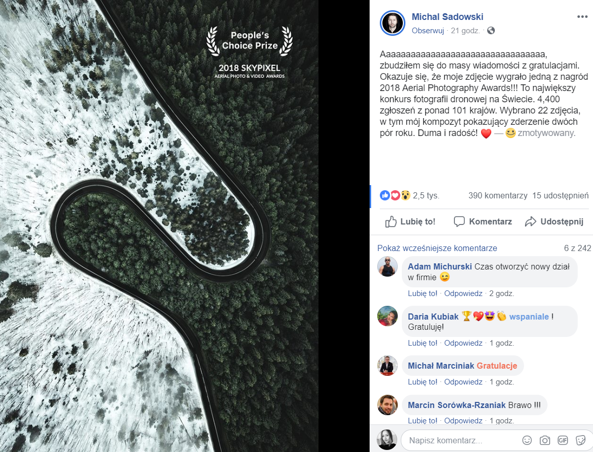 Czy wiedzieliście, że założyciel firmy Brand24 jest fanem fotografii dronowej? I to wcale nie amatorskiej, bo za swoje zdjęcie otrzymał właśnie nagrodę w konkursie 2018 Skypixel Aerial Photography & Video Awards, w którym wyróżniane są najlepsze zdjęcia oraz filmy wykonane dronem.