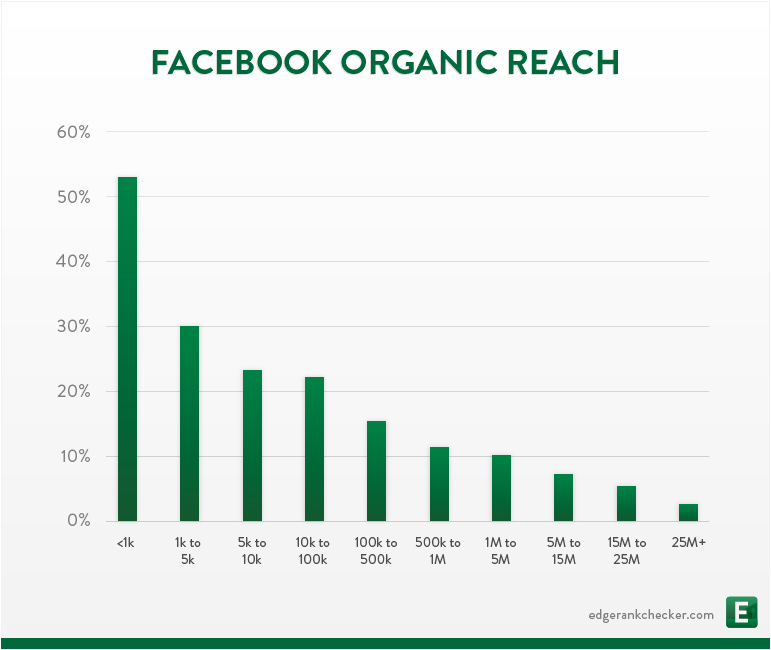 W połowie 2011 roku EdgeRankChecker zmierzył zasięg postów na 1200 fan page’ach w USA i wynosił on niemal 100%, by w grudniu spaść do 40%. Obecnie za średnią uważa się 16% zasięgu postu wśród danego fan page’a. Warto w tym miejscu przytoczyć badanie z czerwca tego roku, które pokazuje, że zasięg wpisów jest odwrotnie proporcjonalny do liczby fanów danej strony.