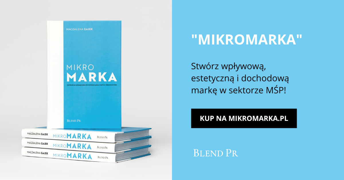 I ja, i Pan doskonale wiemy, że mnóstwo firm – nie tylko tych z sektora MŚP – nie ma stworzonej, a co dopiero wdrażanej strategii marki. Samo hasło „strategia” brzmi trochę przerażająco, abstrakcyjnie. Każdy z nas skalę oraz znaczenie takiego projektu może rozumieć trochę inaczej. W książce wychodzę z założenia, że kluczem do wszystkiego jest prostota. Zachęcam do tworzenia krótkich dokumentów, które w punkt obrazują intencje twórców marek. Strategia jest jednym z nich. Aby zacząć tworzyć wyrazistą markę tak naprawdę wystarczy zdefiniować na kilku slajdach m.in. osobowość, główny przekaz czy obietnicę. W książce opisałam, jak realizujemy taką strategię w Blend PR, więc „Mikromarka” jest także wglądem w know-how mojej firmy.