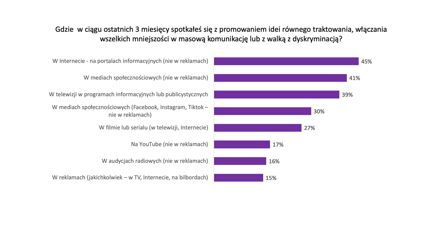 Inkluzywność w marketingu zakłada m.in. prowadzenie komunikacji uwzględniającej osoby o odmiennym kolorze skóry, wyglądzie, stanie zdrowia, wieku, wyznaniu, orientacji seksualnej, czy narodowości. W ostatnim czasie coraz więcej marek nawiązuje w swoich działaniach marketingowych do tematyki równości, jednak badanie Mindshare Polska pokazuje, że w ciągu ostatniego roku jedynie 23 proc. badanych Polaków spotkało się z promowaniem w mediach równego traktowania i włączania mniejszości w masową komunikację lub walkę z dyskryminacją. Uczestnicy badania wskazują, że komunikaty związane z różnorodnością i inkluzywnością docierały do nich najczęściej za pośrednictwem portali informacyjnych, mediów społecznościowych, telewizyjnych programów informacyjnych, ale także filmów i seriali.