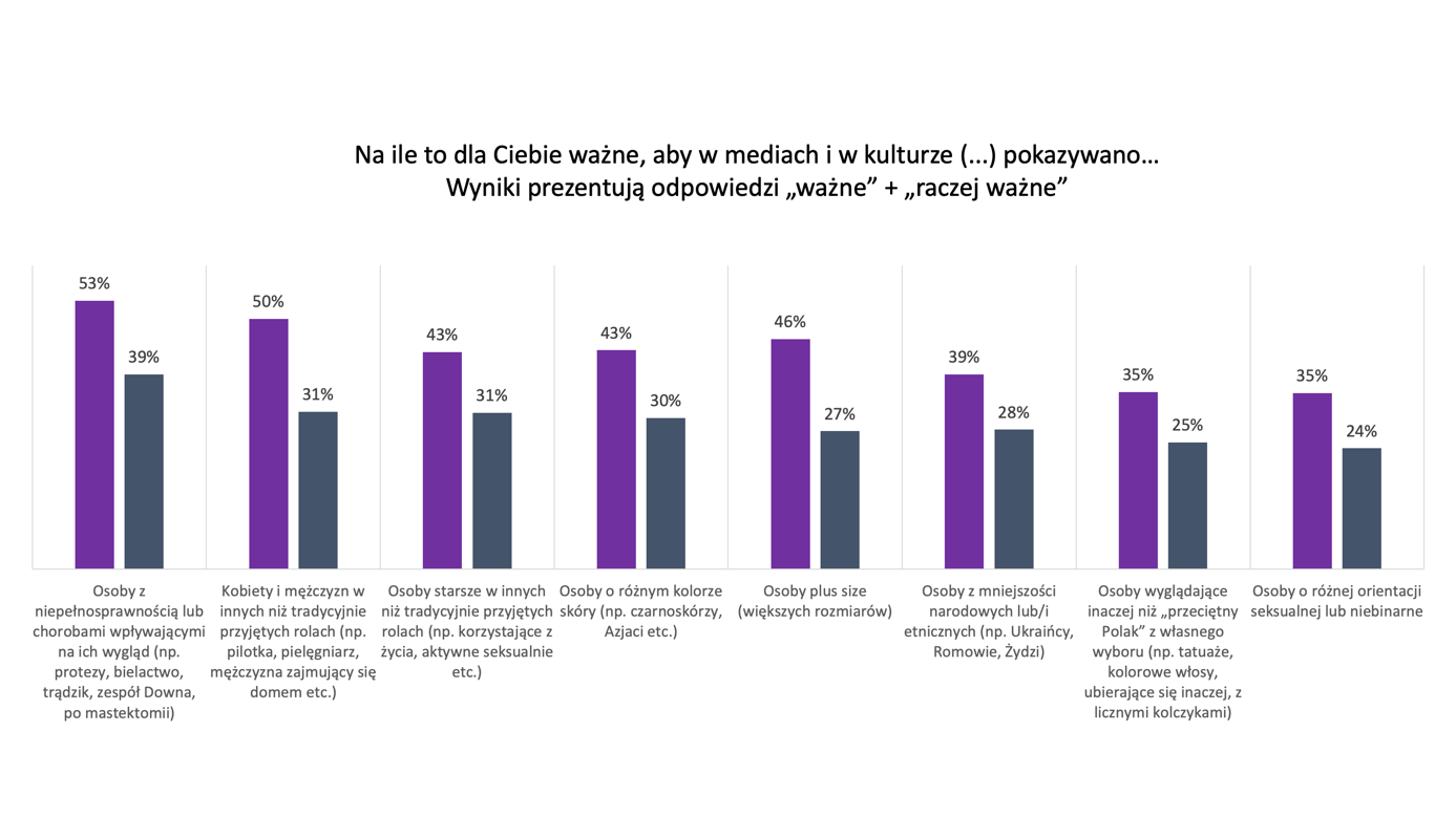 Dla około 40 proc. ankietowanych ważne jest, aby w przekazach medialnych mówić o osobach z niepełnosprawnościami lub chorobami wpływającymi na ich wygląd oraz podkreślać równość ze względu na płeć, wiek, wagę, czy kolor skóry. Dla co trzeciego badanego ważne jest eksponowanie w treściach medialnych mniejszości narodowych, etnicznych, czy osób o innej niż heteroseksualna orientacji. Co ciekawe, bardziej otwarte na takie treści są kobiety, niż mężczyźni.