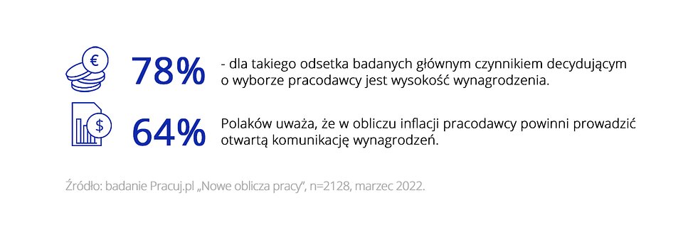 Według danych GUS tempo wzrostu wynagrodzeń w Polsce w lipcu br. wyniosło 15,8%. Natomiast w sierpniu inflacja osiągnęła poziom 16,1%. Od wielu miesięcy trwa wyścig między wzrostem cen a wzrostem wynagrodzeń, w którym oba wskaźniki zamieniają się na pozycji lidera. Trudno się więc dziwić, że wynagrodzenia odgrywają bardzo ważną rolę przy wyborze pracodawcy. Są one głównym czynnikiem decydującym o jego wyborze dla aż 78% Polaków badanych przez Pracuj.pl.