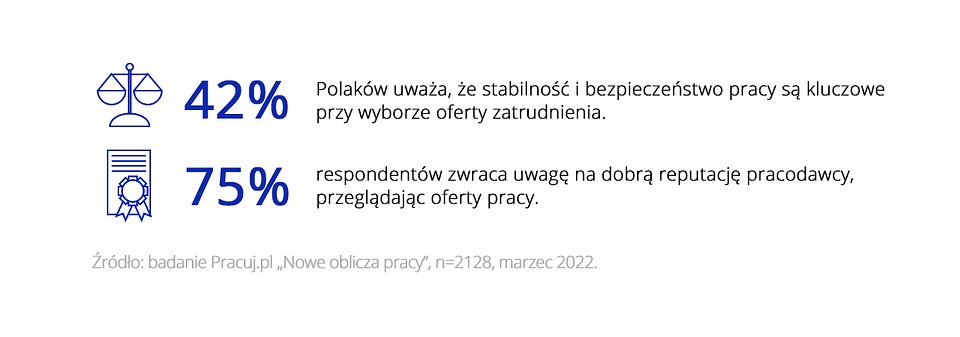 W pierwszym półroczu 2022 roku w serwisie Pracuj.pl pojawiło się prawie 600 tysięcy ofert pracy. Wśród firm szukających pracowników wiele może być nieznanych dla kandydata. Dlatego Polacy często szukają opinii o nich na forach, mediach społecznościowych oraz sięgają po opinie swoich znajomych. Jedną z głównych przyczyn takich działań jest chęć upewnienia się, że firma jest wiarygodna, stabilna i zapewnia bezpieczeństwo zatrudnienia. 42% Polaków badanych przez Pracuj.pl zalicza tę kwestię do czołowej trójki czynników branych pod uwagę przy wyborze pracodawcy.