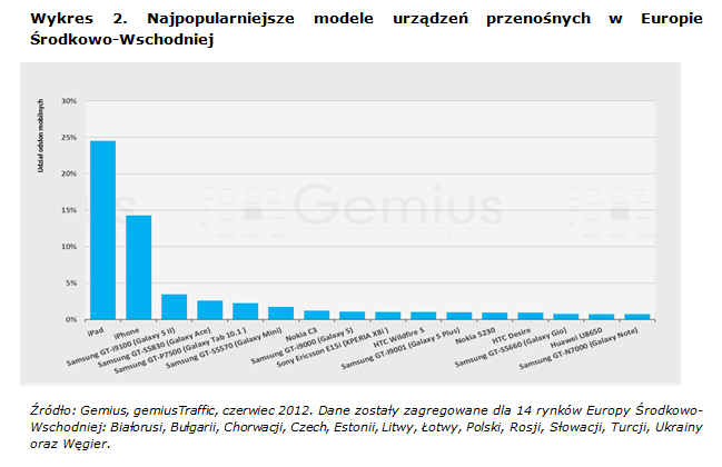 Modele urządzeń przenośnych, które wyraźnie dominują na rynkach Europy Środkowo-Wschodniej to flagowe produkty potentata z Cupertino: iPad oraz iPhone. Podczas gdy iPad cieszy się niezmierna popularnością w Estonii, Rosji i Słowenii (ponad 30% wykonanych odsłon mobilnych w każdym z tych krajów), to iPhone używany jest w szczególności przez Chorwatów (32%). Trzecie miejsce w regionie zajmuje Samsung GT-i9100 (Galaxy SII). Średni odsetek odsłon mobilnych generowanych w tej części Europy za pomocą tego smartfona wyniósł 3,5%, o ponad 20 punktów procentowych mniej niż w przypadku obecnego lidera w regionie – iPada.