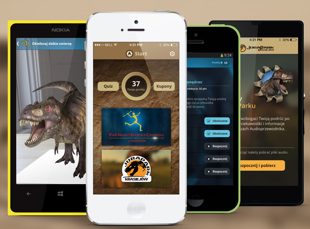 Aplikację dla parku rozrywki, który tworzą park dinozaurów JuraPark oraz ultranowoczesne muzeum człowieka Park Nauki i Ewolucji Człowieka w Krasiejowie przygotowała Aduma S.A. Rozwiązanie multimedialne przygotowane dla użytkowników telefonów z system Android i iOS znalazło już niemal pół tysiąca użytkowników. Składa się z dwóch części. Pierwsza to swoisty audioprzewodnik po JuraParku. – Zawiera on mapę aktywnych punktów, w której można wysłuchać opowieści o konkretnym dinozaurze znajdującym się w jego pobliżu – wyjaśnia Karina Śliwińska, project manager, koordynująca prace nad aplikacją. – Ta część aplikacji ma pomóc gościom JuraParku w odkryciu wszystkich niezwykłości, które można podziwiać w Krasiejowie. To także ciekawy przykład wykorzystania audioprzewodnika niespotykanego masowo w parkach dinozaurów, gdzie tradycyjnego przewodnika można zastąpić mobilnym i prowadzić w ten sposób swój własny tryb zwiedzania. Każde stanowisko JuraParku zostało opatrzone unikalnym kodem QR, a w aplikacje wbudowaliśmy ich skaner. Po odczytaniu kodu aplikacja automatycznie przechodzi do ekranu konkretnego stanowiska oraz włącza przyporządkowane do niego nagranie. Wisienką na torcie tej części są bonusowe pytania quizowe, dołączone do 10 wybranych stanowisk. Zwiedzający nie są informowani o tym, na których stanowiskach są one umieszczone, więc de facto nagradzamy w ten sposób ich cierpliwość i chęć zdobywania wiedzy.