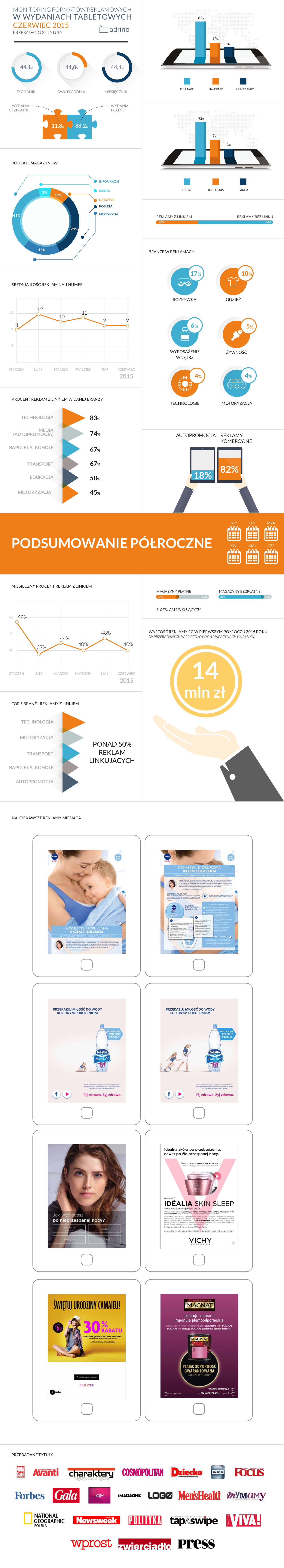 Czerwcowym podsumowaniem zamykamy pierwsze półrocze 2015 roku na tabletach. Szósty miesiąc nie okazał się rewolucyjny jeśli chodzi o reklamę tabletową. Przebadano łącznie 22 tytuły – w sumie 34 numery, gdzie mieliśmy łącznie 313 reklam.
