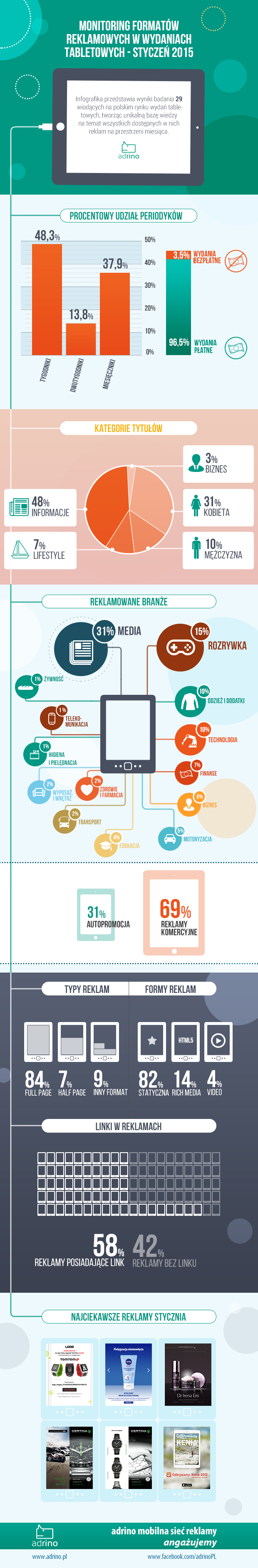 „Pierwszy miesiąc 2015 roku okazał się być niestety nienajlepszy pod względem ilości reklam tabletowych.” – stwierdza Weronika Gładych. Wśród przebadanych 20 najczęściej poczytnych tytułów (29 numerów) było 230 reklam, czyli prawie dwukrotnie mniej niż w grudniu ubiegłego roku i nawet mniej niż średnio w ciągu całych ostatnich 12 miesięcy. Średnia wynosząca 8 reklam na jeden numer może świadczyć o styczniowej stagnacji reklamowej, która widoczna jest w całej branży i najczęściej wynika z nieustalonych jeszcze budżetów reklamowych na Nowy Rok.
