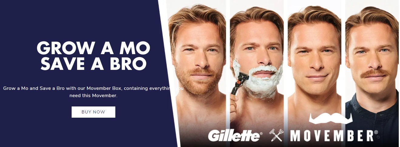 Gilette od kilku lat zachęca do włączenia się w akcję Movember i podcinania czy stylizacji wąsów przy użyciu produktów marki. W tym roku, chcąc promować zdrowie mężczyzn w Europie, marka przekazała na rzecz Movember 500 tys. euro w walce z rakiem prostaty i jąder.