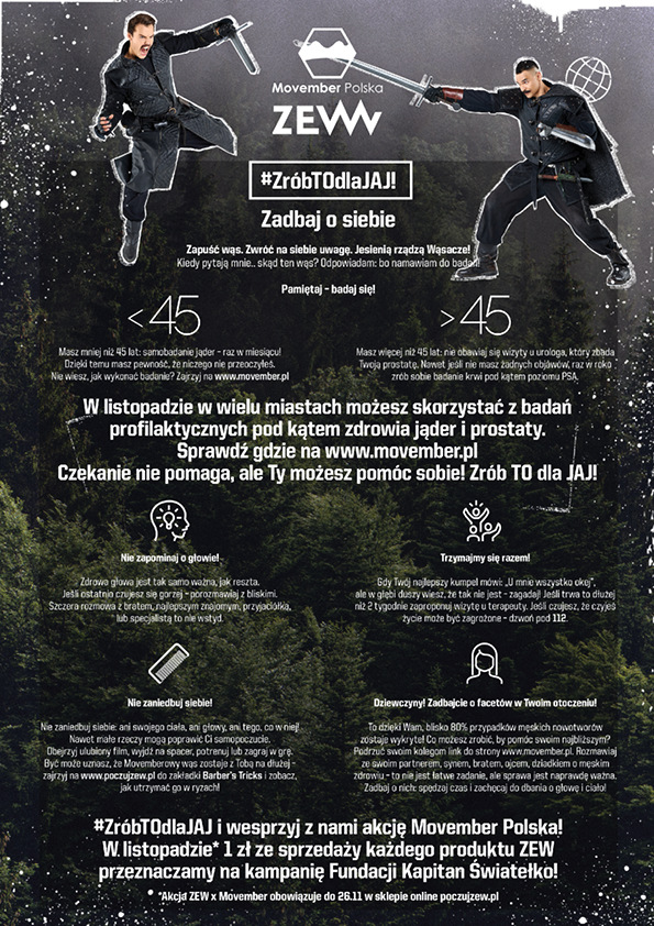ZEW dołączyło do wsparcia polskiej akcji i wspólnie z jej organizatorem, Fundacją Kapitan Światełko, podnosi świadomość społeczną na temat problemów zdrowotnych mężczyzn. Marka zachęca ich do „brania spraw w swoje ręce”, czyli regularnego badania i dbania o swoje zdrowie fizyczne i psychiczne.