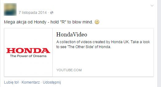 Interaktywny film promujący dwa oblicza Hondy Civic Type R, przedstawiał dwa style, dwie osobowości, a raczej dwie twarze użytkownika, w końcu dwie możliwości jazdy. Harmonia przeplatała się z emocjonującym driftem. Użytkownik poprzez naciśnięcie przycisku wybierał i zmieniał styl jazdy, a w ten sposób historię.