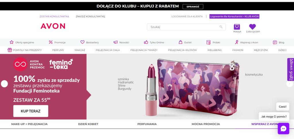 Z okazji Dnia Kobiet, marka Avon zorganizowała akcję „Mów o tym głośno i świeć przykładem”. W ramach inicjatywy, powstał limitowany zestaw kosmetyków, w którego skład wchodzi szminka i kosmetyczka. Całkowity zysk ze sprzedaży zestawu zostanie przekazany fundacji Feminoteka, która na co dzień wspiera kobiety doświadczające przemocy. Kupując zestaw, dofinansowane zostanie m.in. działanie pierwszej i jedynej w Polsce aplikacji przeciwprzemocowej Avon Alert, z której skorzystało już 55 tys. użytkowniczek.