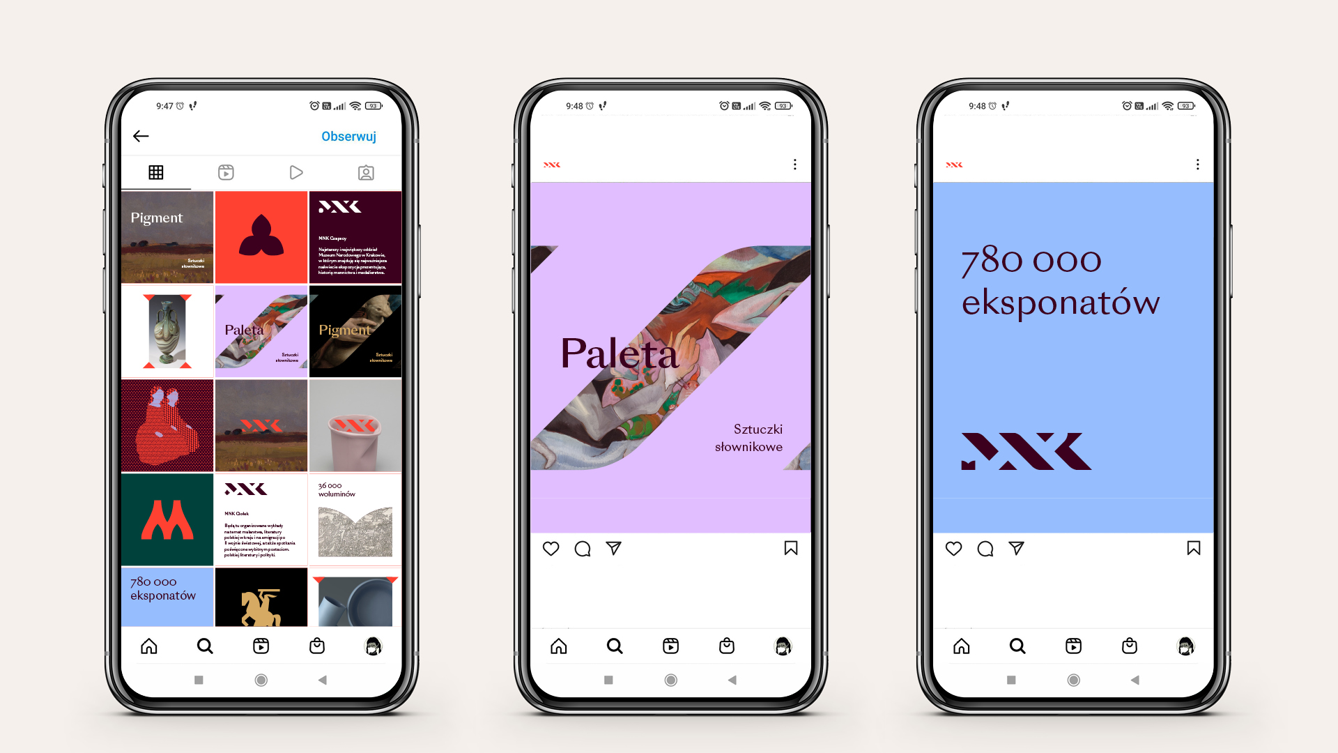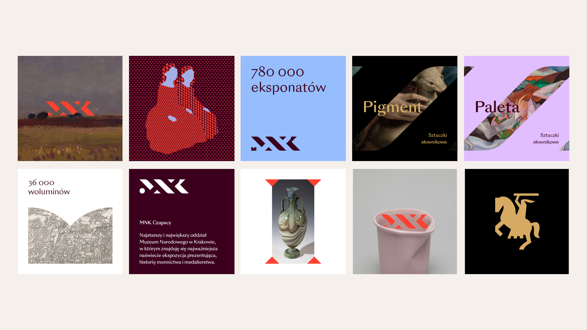 W ramach prac projektowych powstał też system layoutów do komunikacji wewnętrznej i zewnętrznej, pozwalający promować nie tylko znak MNK, ale przede wszystkim dzieła z kolekcji Muzeum. Identyfikacja obejmuje system autorskich ilustracji oraz stworzenie dynamicznego języka z myślą o komunikacji m.in. z młodymi odbiorcami, a także narzędzie do tworzenia unikatowych kolekcji upominków muzealnych.