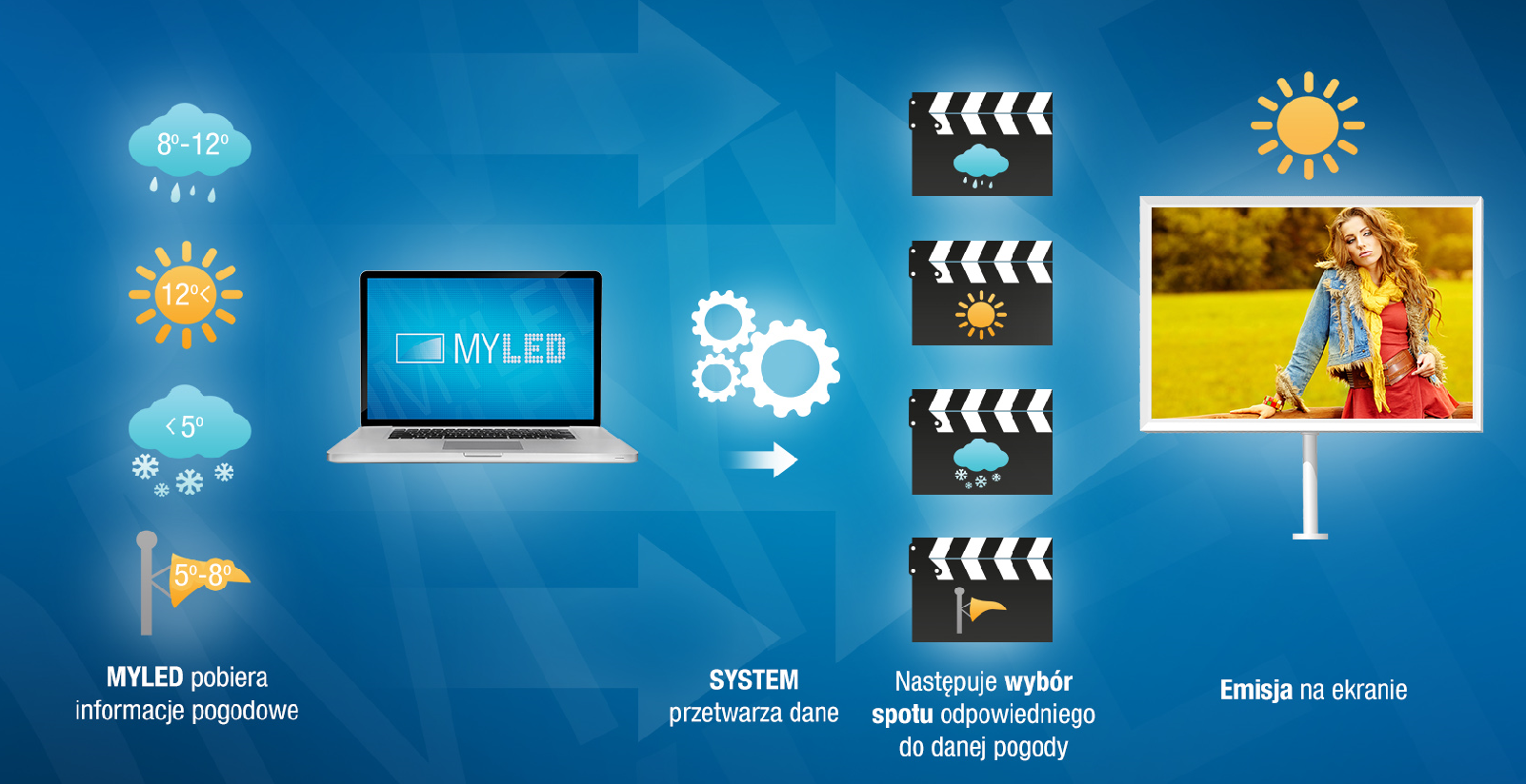 System w czasie rzeczywistym wykorzystuje informacje pogodowe dostępne w sieci i warunkuje nimi treść emitowanej w danym momencie, reklamy. Emisja komunikatu, którym zarządza MyLED logicznie dopasowana jest do pogody.