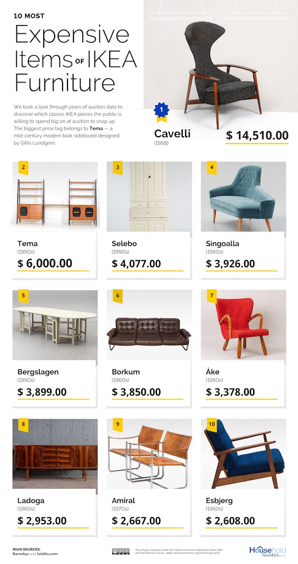 Wśród najdroższych zabytkowych produktów IKEA znalazł się kredens TEMA – jego cena sięga 6000 dolarów. Co ciekawe, w 1962 roku ten sam mebel kosztował zaledwie 40 dolarów. Szafka SELBO została wyceniona na 4077 dolarów, a leżanka SINGOALLA – 3926 dolarów. Jednak najbardziej poszukiwanym przedmiotem z dawenj kolekcji IKEA jest obecnie krzesło VILBERT, stworzone przez cenionego duńskiego projektanta Vernera Pantona. IKEA wyprodukowała tylko 4 tys. tych krzeseł, które obecnie sprzedają się za kwotę dwadzieścia razy większą niż pierwotna cena.