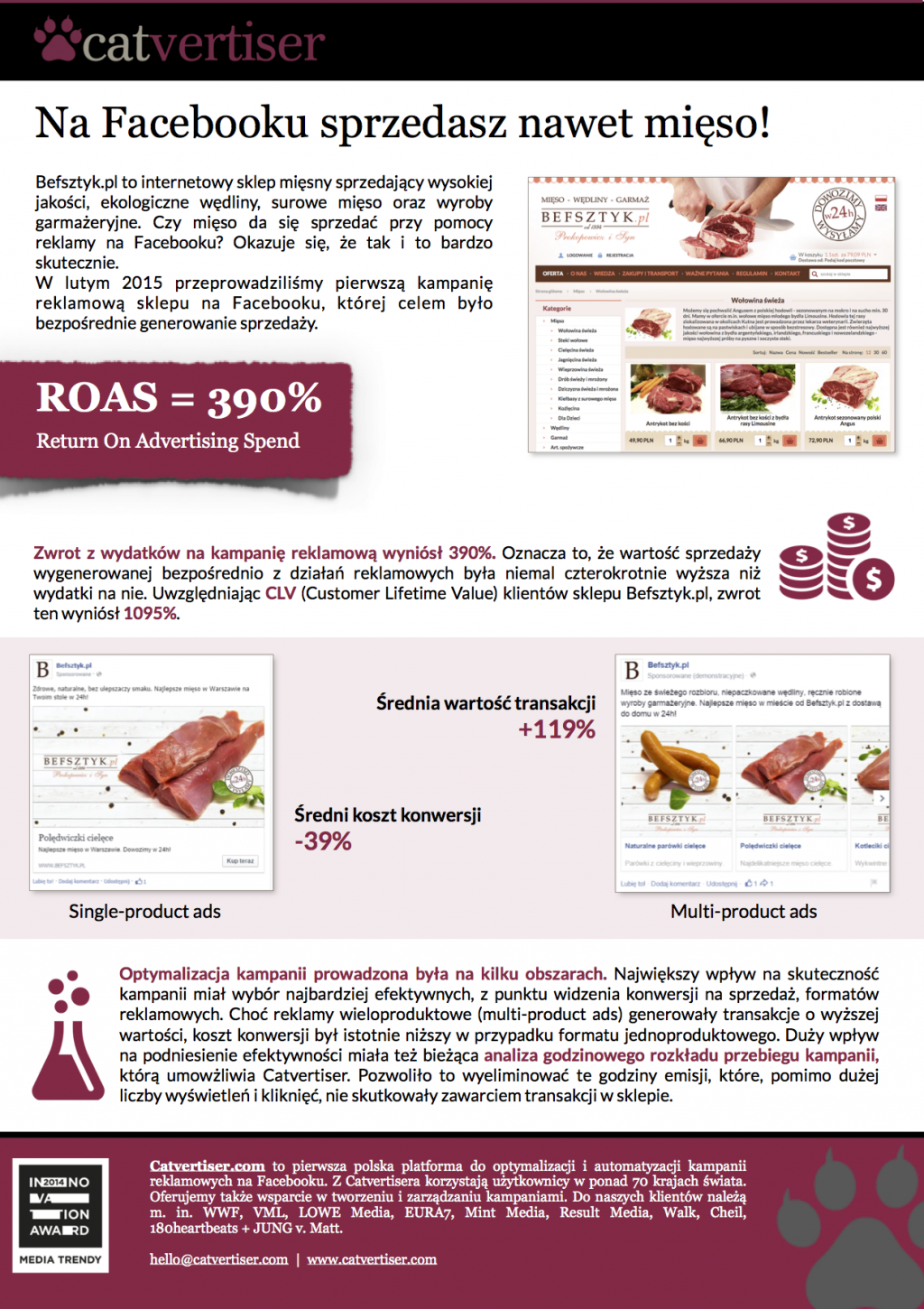 W lutym Catvertiser przeprowadził pierwszą tego typu kampanię dla popularnego warszawskiego sklepu mięsnego Befsztyk, który od kilku lat prowadzi także sprzedaż online – www.befsztyk.pl. Jej efekty były pozytywnie zaskakujące. Okazało się, że przy umiejętnym wykorzystaniu zaawansowanych opcji targetowania reklamy i remarketingu oraz optymalizacji działania między innymi pod kątem najbardziej efektywnych dni tygodnia i pór dnia, mięso i wędliny na Facebooku idą jak ciepłe bułeczki.