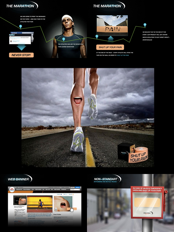 Wyzwaniem dla teamu Ewy Cymer było stworzenie w ciągu dwóch dni idei kreatywnej dla kampanii, która miała promować wprowadzenie na rynek pomagającej wrócić do formy po urazach sportowych nowej taśmy kinestetycznej Bowstring. Zespół przygotował zintegrowaną kampanię, której hasłem przewodnim było „Shut up your pain” (ucisz swój ból). Proponowana akcja obejmowała spoty telewizyjne, event, ambient, plakaty, reklamę prasową oraz mailing tradycyjny skierowany do fizjoterapeutów.